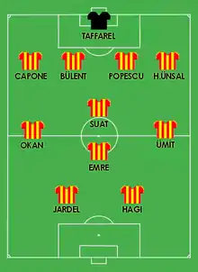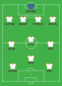 Bülent-Reha Eken brothers; Suat Mamat who scored three goals in the 1954 FIFA World Cup;[26] Coşkun Özarı who devoted his life to Galatasaray;[27] Turgay Şeren the heroic goalkeeper who was called "the Panther of Berlin";[28] Fatih Terim, the team captain of Galatasaray and Turkish national football team for many years, who won the UEFA Cup in 2000 as the team's coach;[29] Metin Oktay the legendary six-time top-scorer of the Turkish Super League;[30] Zoran Simović, another skilled goalkeeper known for his penalty saves;[31] Cüneyt Tanman who played a record of 342 games for Galatasaray;[32] Tanju Çolak, an extraordinary goalscorer and the 1988 European Golden Boot winner with Galatasaray;[33] Cevad Prekazi, an Albanian teammate of Tanju Çolak specializing in free kicks;[34] Cláudio Taffarel the World Cup-winning goalkeeper for Brazil;[35] Gheorghe Hagi, the Romanian football hero who is still described by some as the best foreign player ever to play in Turkey;[36] Brazilian striker Mário Jardel, dubbed "Super Mário" by the fans and scored both of Galatasaray's two goals in the 2000 European Super Cup Final against Real Madrid; and last, but not least, Hakan Şükür, the player who scored most goals in Süper Lig history with 249.