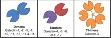 There are three different forms of galectin structure: dimeric, tandem or chimera. Dimeric galectins, also called prototypical galectins, are homodimers, consisting of two identical galectin subunits that have associated with one another. The galectins that fall under this category are galectin-1, -2, -5, -7, -10, -11, -14 and -15. Tandem galectins contain at least two distinct carbohydrate recognition domains (CRD) within one polypeptide, thus are considered intrinsically divalent. The CRDs are linked with a small peptide domain. Tandem galectins include galectin-4, -6, -8, -9 and -12. The final galectin is galectin-3 which is the only galectin found in the chimera category in vertebrates. Galectin-3 has one CRD and a long non-lectin domain. Galectin-3 can exist in monomeric form or can associate via the non-lectin domain into multivalent complexes up to a pentameric form.[3] This allows galectin-3 to bridge effectively between different ligands and form adhesive networks. The formation of multimers is concentration dependent. When Galectin-3 is at a low concentration it is monomeric and likely to inhibit adhesion. It binds to adhesion proteins such as integrins and blocks further binding to other cells or the extracellular matrix. When concentrations of galectin-3 are high it forms large complexes that assist in adhesion by bridging between cells or cells and the extracellular matrix. Many isoforms of galectins have been found due to different splicing variants. For example, Galectin-8 has seven different mRNAs encoding for both tandem and dimeric forms. The type of galectin-8 that is expressed is dependent on the tissue.[4] Galectin-9 has three different isoforms which differ in the length of the linker region.[4]