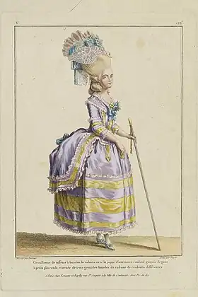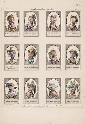 Galerie des modes was conceived during the final decades of the 1700s, a period when France was at the forefront of fashion innovation. To quote the historian James Laver, at this time "fashionable clothes...meant French clothes."[2] This supreme influence was undoubtedly strengthened by Queen Marie Antoinette as well as figures such as Rose Bertin (her dressmaker) and Monsieur Léonard Autié (her hairdresser) who were responsible for designing her iconic courtly wardrobe.[3] Beginning in the 1770s (the decade during which Antoinette both married future king Louis-Auguste and assumed the title Queen of France and Navarre), women's dress came to exhibit greater variation than ever before; the fashion plate emerged under these conditions, as if to disseminate each budding trend.