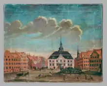 Already prior to Absolon's construction of his castle on Slotsholmen, there seems to have been a marketplace at Gammeltorv, possibly also a Thing.[1] Copenhagen's first town hall, of which practically nothing is known, was built on the east side of the square but later destroyed during Hanseatic capture and pillaging of the city in 1368. In 1374 the square is referred to as Forum and in 1446 the square is referred to as "the old square" as opposed to the somewhat younger Amagertorv. From 1470 the name Gammeltorv is used consistently.