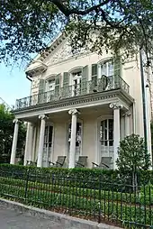 - Squires House, 2220 St. Charles Avenue, built in 1851 as one-and-half story Greek Revival residence for George Washington Squires, a commercial merchant. The house was remodeled to its present appearance in 1884 by builder James Kelly for William Renaud, a grocer and commercial merchant. In 1920, the Liberty Shop, known for its gowns and regalia for carnival royalty, began to lease the property. The House of Broel, a dress shop, began operations at Squires House in 1970.[27]