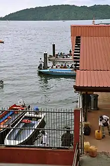 Starting from 1970s, Filipino-Moro refugees comprising Tausūg and Bajau peoples began to inhabit the island in their bid to escape from the war in the southern Philippines.[3] Both the Malaysian federal government and the Sabah state government do not officially recognise the settlement and the inhabitants as they are known as illegal immigrants. The eastern shore of Gaya Island supports a well-known illegal Filipino colony, called Kampung Lok Urai, with stilt houses girdling the beach as far as the eye can see. It has a 6,000 floating population of largely Filipinos who provide Kota Kinabalu with a source of cheap labour. It is considered a dangerous, high crime or "no-go" area by the police and KK-ian locals. The stilt houses are linked by walkways of weathered planks. As the population grew, new houses spread seaward, with no regard for sanitation.[3] The population in the island have also been criticised for their rubbish throwing attitude, where most of the rubbish will be found floating around the sea near their settlements.[4] Three fires in 1994, 1998 and in 2014 have wiped out nearly half of Kampung Pondo.[5]