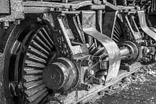 The Shay locomotive features an offset boiler with a multiple-cylinder engine affixed to it on the opposite side, driving a longitudinal shaft geared to the axles via bevel gears (see also Ephraim Shay, inventor).