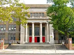 The building was designed by Irwin T. Catharine and built in 1927–1928. It is a three-story, 15 bay, yellow brick building in a Classical Revival-style. It features a projecting center entrance bay with portico and Ionic order columns.[2]