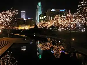 Gene Leahy Mall, also known locally as Central Park or The Mall, is a 9.6-acre (39,000 m2) park located at 1302 Farnam on the Mall in Downtown Omaha, Nebraska, U.S.A., and bordered by South 10th Street. There are also two huge slides, a sculpture garden, a remote-control boat cove, a large children's play area, and an amphitheater where outdoor concerts are held in the summer. The mall is decorated with thousands of lights during the winter holiday season.[1][2] Connected on its eastern edge with the Heartland of America Park, it is also borders the former site of the W. Dale Clark Library (demolished in fall 2022), the former Burlington Headquarters Building, the Old Market and the ConAgra campus.