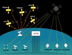 The General Coordinates Network (GCN), formerly known as the Gamma-ray burst Coordinates Network, is an open-source platform created by NASA to receive and transmit alerts about astronomical transient phenomena. This includes neutrino detections by observatories such as IceCube or Super-Kamiokande, gravitational wave events from the LIGO, Virgo and KAGRA interferometers, and gamma-ray bursts observed by Fermi, Swift or INTEGRAL.[1] One of the main goals is to allow for follow-up observations of an event by other observatories, in hope to observe multi-messenger events.[2][3]