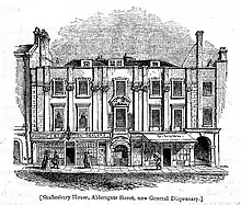 The dispensary was situated at 36 Aldersgate Street, a building that had been built for the Marquis of Dorchester and subsequently became "Dorchester House". It later became the City of London Lying-in Hospital before being used as dispensary.[5]