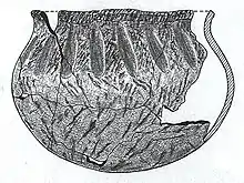 Langford ware was first reported at the Fisher site, and has also been found at the nearby Zimmerman[3][9] and Plum Island[2] sites. It is characterized by grit-tempered, globular vessels with restricted orifice and well-defined shoulders and excurved rim profiles. Surface finish is usually smoothed and decoration, when present, is applied to the neck and shoulder areas and consists of incised and trailed lines, punctates and finger impressions, combined to form arches and festoons. Lugs and loop handles are present on some vessels and nodes are also sometimes present.[1][2][3][9]