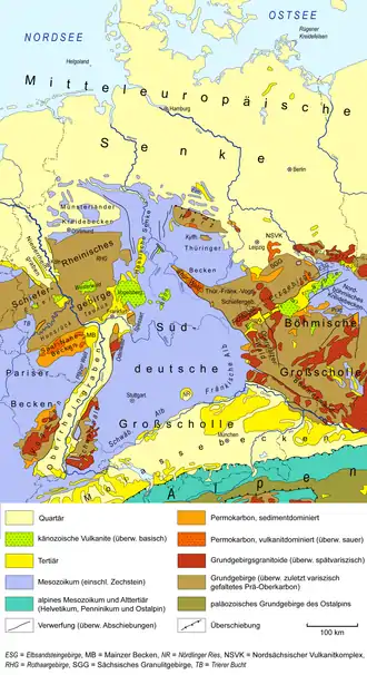The Cenozoic platform (German: Känozoisches Deckgebirge) comprises Tertiary and Quaternary rocks. It is also known as the "unconsolidated rock" level (German: Lockergesteinsstockwerk) because, due to their young age, the Cenozoic sedimentary rocks have often not experienced intensive diagenesis and are therefore often not cemented. Because the youngest deposits in an uplifted area are removed first, the Cenozoic platform deposits occur extensively only in young Cenozoic subsidence areas in the Central European Blocks region where the largest outcrops are the Upper Rhine Graben, the Mainz Basin and the Molasse Basin (Alpine foreland trough). Special "subsidence areas" are the Nördlinger Ries and the Steinheim crater, both originating through a meteorite impact event.[3] The Cenozoic deposits in the Central European Blocks region consist of both siliciclastic rocks and limestones and both marine and continental sediments. The Cenozoic in Germany is also represented by volcanic rocks. In contrast to the mostly acidic (SiO2-rich) volcanic rocks of the transition level, the Cenozoic formations are mostly intermediate to very SiO2-poor (trachyte, basalt, phonolite, tephrite, nephelinite and basanite).[4] The largest Cenozoic volcanic areas in Germany are the Vogelsberg Mountains, the Westerwald, the Rhön Mountains and the Eifel.