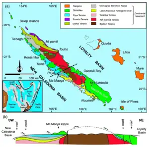 However, these were followed by a new collisional event. The abyssal lithosphere east of Grande Terre subducted under an oceanic plate in the east in the South Loyalty Basin.[2] Hence, the associated volcanism during the Eocene is believed to have created the sinuous volcanic island arc of Loyalty Islands/Ridge as the smaller part of the territory.[2] The epoch also oversaw a series of displacement of the oceanic lithosphere onto the east of the continental Norfolk Ridge.[2] One of the products of these dynamic events is the famous and economically significant Peridotite Nappe.[2][3][10][11][12][13] This is followed by intrusions of granitoids into the country rocks on Grande Terre.[14]