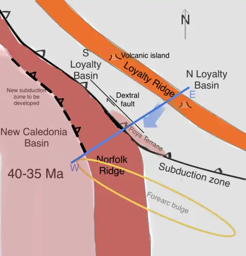 The presence of the subduction-obduction complex suggests a sequence of a new intra-oceanic subduction zone with dextral components.[2][13] The interception of the trench and the Norfolk Ridge evolved into Grande Terre.[13] The basaltic Poya Terrane and the South Loyalty Basin can be interpreted as the new forearc, with an extinct trench along the Basin, while the North Loyalty Basin is the backarc.[2] As the oceanic lithosphere of the Australian Plate was subducting under an oceanic plate in the northeast, the descending slab metamorphosed to become the Diahot and Pouébo Terranes under high pressure.[2] The moisture released from metamorphism caused partial melting, initiating a series of extrusive volcanism to form the arc of Loyalty Ridge/Islands.[2] The oblique subduction was then jammed by the more buoyant continental lithosphere of the Norfolk Ridge, which resists sinkage further into the mantle.[2][46] Instead, the oceanic lithosphere obducted above the basement of the Norfolk Ridge, thus bringing units like the Poya Terrane and the Peridotite Nappe onto Grande Terre.[2][36]