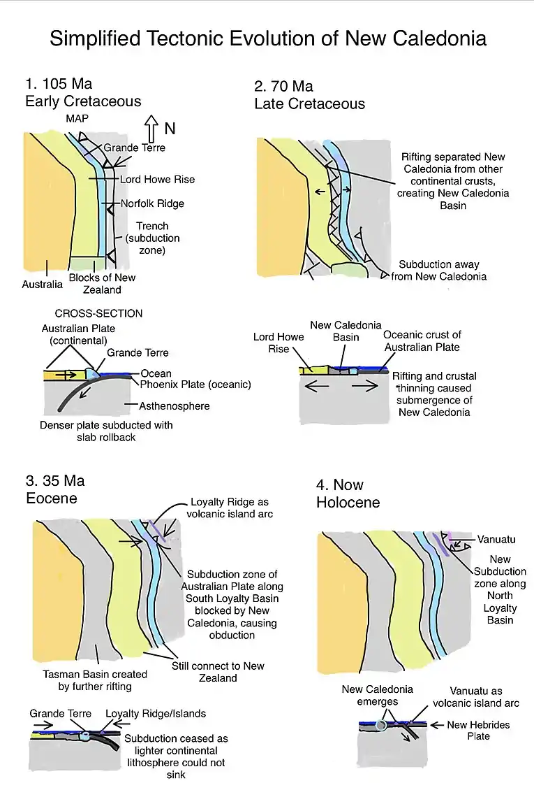 In the Late Cretaceous, marginal rifting occurred on the island, leading to the complete submergence of the island.[2][7] On a macro-scale, as evidenced by the presence of endemic fossil species, Zealandia drifted away from the rest of Gondwana relatively to the northeast, particularly away from the Australian and the Antarctic land masses.[2][42] These are probably accommodated by the trench rollback of the previous subduction zone, with backarc extension taking place in the East.[43][44][45] Units like the Formation à charbon and the Koné Terrane are all consistent with the hypothesis that Grande Terre was laid on a passive margin.[2][7] Meanwhile, the Boghen Terrane's high-pressure schists exhumed due to rifting and unloading.[2]