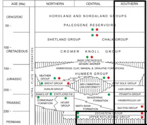 During this era the end of extensional tectonics had been well constrained in the southern North Sea basin; the extension occurred from the late Carboniferous to the Triassic.[2] There had been some reactivation of Varsican basement faults due to the subsidence of the Sole Pit Basin and allowing basin tilts creating a peripheral graben system around the basin.[1] Due to the reactivation of the basement faults it led to the beginning of halokinesis in the basin.[3] The halokinesis allowed major uplift during the Mesozoic because of the presence of salt and the reactivation of basement faults; the thrusting permitted the sediment to thrust over the diapirs and float on top of the Zechstein salt.[5] Due to the Kimmerian phase uplift in the northern portion of the North Sea, it allowed subsidence and deposition to fill the basin, creating sandstone. Due to differential loading along the faults, salt diapirs developed and played a huge role in the southern North Sea basin and all salt tectonic structures.[5] Reverse faulting associated with late Carboniferous basin inversion is recorded by a wide range of Carboniferous stratigraphy subcropping the Permian sediments. The subcrop pattern indicates a strong influence of NW–SE tectonic trends during this inversion. This inversion event was followed by deposition of upper Carboniferous red beds, which pass up into sands of the Permian Rotliegend Group; these are overlain by evaporites of the Zechstein Supergroup.[1] A major phase of basin inversion during or at the end of the Late Cretaceous affected many basins in northwestern Europe, including the Sole Pit Basin and the Cleveland Basin, and has been attributed to strike-slip reactivation of basement faults.[3]