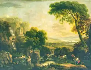 Early in his career Barret produced many oil paintings of classical scenery, often incorporating mythological figures. There is no evidence that he travelled to Italy.[4] Most, if not all, of the paintings appear to have been commissioned for houses in Ireland. Thomas Bodkin considered that the oil paintings of Tivoli in Italy to be more likely to be work of his son George Barret junior. who also produced many works with classical themes. However, these can now be securely attributed to the elder Barret.