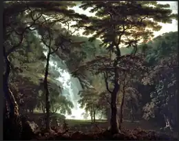 Following work for Samuel Madden and the Earl of Milltown, Barret started to produce paintings of Irish landscapes. These portrayed the actual landscape and not capriccio scenery. This was a natural progression from his previous idealised Italianate scenery. Barret is particularly associated with Edward Wingfield who in 1751 became Viscount Powerscourt.[9] Wingfield owned Powerscourt House and extensive estates to the south of Dublin in County Wicklow. These included the scenic river Dargle with its craggy red rocks and impressive Powerscourt Waterfall that is the second highest in Ireland. Scenery on the Dargle often figures in Barret's surviving oil paintings and he also painted at Avoca in the south of County Wicklow.[10] A View of Powerscourt House under the Sugar Loaf Mountain is now at the Yale Center for British Art, and a version of Barret's Powerscourt Waterfall is in the National Gallery of Ireland.[11]