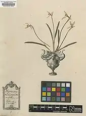 Many of the specimens in the collection are mounted on the paper contemporary with their preservation, but some have been remounted on a type of paper used by the British Museum.[2] They are labelled in various hands, including Clifford's own.[2] Many are mounted using a label made to look like an urn; a method typical of and exclusive to Dutch herbaria of the period.[2][3] Various styles of urn were used.[2]