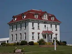 The George Johnson House is a 2½-story frame dwelling built on a coursed limestone foundation with a full basement. The entire structure is square and measures 40 by 40 feet (12 by 12 m).[2] The front entrance faces the road to the east. The enclosed porch with a mansard roof on the back of the house is original, but the front porch is not. The front porch features balustrades on the lower level and on the roof, which can be accessed from the second floor. The exterior is clad in tongue-and-groove pine siding that simulates ashlar masonry. The window sills and hoods are boxed wood construction and made to look like solid stone. The house is capped with a concave mansard roof with dormers on the lower portion that rises to a flat portion with a widow's walk, which originally had a metal balustrade. Paired wooden brackets with pendants are located below the eaves. Between the brackets is a row of dentils located above a paneled frieze. A rope mold separates the cornice zone from the rest of the wall section.