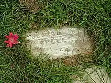 Machine Gun Kelly spent his remaining 21 years in prison. During his time at Alcatraz, he got the nickname "Pop Gun Kelly." According to fellow inmate Dale Stamphill, the nickname originated because, "He told big fish stories. The cons called him ‘Pop Gun Kelly’ after cork guns that were popular with kids...the guys didn’t take him seriously...." This may have stemmed from the fact that, in addition to his exaggerated tall tales, Kelly was a model prisoner and did not act like the brutal gangster his wife, the media, and FBI had made him out to be.[18][19][20][21] He spent 17 years on Alcatraz as inmate number 117, working in the prison industries, continuing to boast and exaggerate his past escapades to other inmates, and was quietly transferred back to Leavenworth in 1951. He died of a heart attack at Leavenworth on July 18, 1954, the day after his 54th birthday, and was buried at Cottondale Texas Cemetery in Kathryn Kelly's stepfather's family plot[22][23] with a small headstone marked "George B. Kelley 1954".[24] Kathryn Kelly was released from prison in 1958 and lived in relative anonymity in Oklahoma under the assumed name "Lera Cleo Kelly" until her death in 1985 at the age of 81.[25]