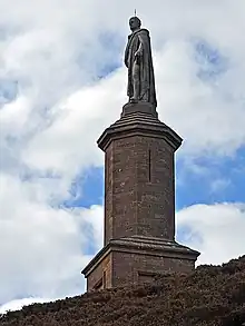 In 1837 a large monument, known locally as the Mannie, was erected on Ben Bhraggie near Golspie to commemorate the Duke's life.[14] The existence of this statue has been the subject of some controversy—in 1994, Sandy Lindsay, a former Scottish National Party councillor from Inverness proposed its demolition. He later altered his plan, asking permission from the local council to relocate the statue and replace it with plaques telling the story of the Clearances. Lindsay proposed moving the statue to the grounds of Dunrobin Castle, after the J. Paul Getty Museum in Los Angeles declined his offer to take it.[15] There was a failed attempt by vandals to topple the statue in November 2011. A BBC news report of this incident quoted a local person saying that few people wished the statue removed; instead they saw it as an important reminder of history.[16] As of January 2017, however, the statue still stands.
