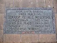 McGovern was born in the 600‑person farming community of Avon, South Dakota.[1][2] His father, the Rev. Joseph C. McGovern, born in 1868, was pastor of the local Wesleyan Methodist Church there.[2][3] Joseph – the son of an alcoholic who had immigrated from Ireland[4] – had grown up in several states, working in coal mines from the age of nine and parentless from the age of thirteen.[5] He had been a professional baseball player in the minor leagues,[nb 2] but had given it up due to his teammates' heavy drinking, gambling, and womanizing, and entered the seminary instead.[4] George's mother was the former Frances McLean, born c. 1890 and initially raised in Ontario, Canada; her family had later moved to Calgary, Alberta, and then she came to South Dakota looking for work as a secretary.[4][7][8] George was the second oldest of four children.[4] Joseph McGovern's salary never reached $100 per month, and he often received compensation in the form of potatoes, cabbages, or other food items.[2][9] Joseph and Frances McGovern were both firm Republicans, but were not politically active or doctrinaire.[10][11]