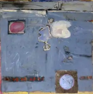 Miyasaki's paintings and lithographs from the 1950s, such as Green Landscape, in the collection of the Honolulu Museum of Art, are typical of abstract expressionism. In the 1960s, his work began to incorporate well defined forms, an example of which is Red Eye from 1963.[5] "Miyasaki's paintings radiate an expressionistic intensity derived not from the discordant drips and splashes of the spontaneous Ab Ex encounter, but from a meticulous compositional strategy that uses subtle juxtapositions of color and line to achieve an overall sense of resolution and harmony."[1] In his later Magnolia Edition collagraphs, the "muscular and delicate elements" showed that the West Coast strain of Abstract Expressionism to be every bit as vital and impressive as its New York counterpart," according to Bay Area writer Nick Stone.[6] His work is included in the collections of The Art Institute of Chicago, the British Museum (London), the Brooklyn Museum, the Honolulu Museum of Art the Metropolitan Museum of Art, the Museum of Fine Arts, Boston, the Museum of Modern Art (New York City), the National Gallery of Art (Washington, D.C), the Philadelphia Museum of Art, the San Francisco Museum of Modern Art, and the Whitney Museum of American Art (New York City).[7][1]