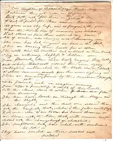 Pirie was a poet, and was remembered as one of Canada's Scottish Canadian poets in a 1900 book published in Toronto by the Caledonia Society.[4] His poetry generally dealt with Canadian patriotism, and social issues such as poverty, and temperance. One of his best known poems was "The Volunteers of Canada". He also tackled contemporary issues such as Louis Riel in his poem entitled "The Murder of Thomas Scott".[5] He wrote on the Fenian Raids, the difficulties faced by new immigrants, the exploitation of textile workers, and Scottish history. His private and unpublished papers included some romantic poems, and poems relating to death and mourning. A selection of his poems were published in pamphlet form by the Guelph Herald as "Lyrics of the Late George Pirie, Esq."[6] Much of his writing was lost in a house fire, although a booklet of handwritten unpublished poetry, primarily romantic, has been preserved.