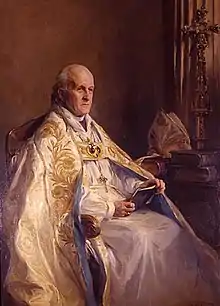 Although the Executive Committee was chaired by the Earl Marshal, the Archbishop of Canterbury, Cosmo Lang, was also a driving force behind the preparations for the 1937 coronation; and many of the decisions about the order of service were made by or with him. He was an ex officio member of both the Executive Committee and the Coronation Committee, which dealt with the detail and, as such, he attended all of the rehearsals. He tended to take a leading role in the planning process, becoming a key mediator when queries arose, and dealing with questions of how the service should be broadcast by the media.[8] Lang also spoke to the nation through the BBC services in the run-up to Coronation Day; he saw the Coronation as an opportunity for the spiritual renewal of the nation, and he organised a campaign of evangelism called Recall to Religion, which he launched on 27 December 1936 with an address on BBC radio. He was also keen to ensure that the King and Queen understood the religious nuances of the service, and held two meetings with the couple beforehand.[9]