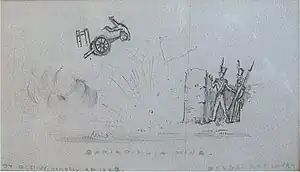 Inside the gate leading to the park we placed two six pounders double charged with grape, one under Acting Sub-Conductor Crow and Sergeant Stewart, with the lighted matches in their hands, and with orders that, if any attempt was made to force the gate, both guns were to be fired at once, and they were to fall back on that part of the Magazine in which Lt Willoughby and I were posted. The principal gate of the Magazine was similarly defended by two guns, with the "chevaux de frieze" laid down on the inside. For the further defence of this gate and the Magazine in its vicinity there were two six pounders so placed as both to command the gate and a small bastion in its vicinity. Within sixty yards of the gate, and in front of the office, and commanding two cross-roads, were three six pounders and one twenty four pounder howitzer which could be so managed as to act on any part of the Magazine in that neighbourhood. After all these guns and howitzers had been placed in the several positions above named they were loaded with double charges of grape.[2]: 76