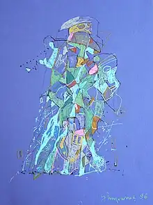 The artist mentions an attraction for the imagery of Jean Dubuffet and was influenced by Victor Brauner. Romanian traditional embroidery and textile work was not only an influence; enlisting a talented seamstress the painter actually produced a few artist designed dresses she wore at at least one vernissage. In her studio, a large antique oriental rug was hanging over the sofa and a book about embroidery, as well as a large album on Mughal painting were commonplace. Orthodox Church decoration and painting were subliminally present, as she absorbed its language as a child. Not least, her husband's graphic sensibilities were integrated at maturity and are revealed in almost symbiotic fashion in the last period of her work, when she is immobilized by disease and resumes drawing. Out of a limitation, she releases another expression, interestingly merging stylistically with Octav's, who was already absent since ten years.