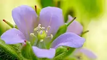 The inflorescence is a cluster of one to several small flowers. Each flower has five-pointed sepals which can be as long as the petals, and five-notched petals in shades of white, light pink to lavender. This is a distinguishing factor for discriminating G. carolinianum from other species of Geranium. The flowers form in short tight clusters which grow off the main stems. The anthers do not have nectar spurs. The carpels have hair and are fused together. There are five carpels and one pistil. The petals are rounded. The color of the sepals is green to brown; they are ovate. Despite being thin, dry and paper-like, the sepals are flexible.[6] The plant does not persist after flowering. Flowers of G. carolinianum bloom in late May to July. They do not give off any strong aroma or scent to attract pollinators into visiting the flower, but rather depend on visual stimuli for insects to be attracted for the benefit of the naturally produced sap.