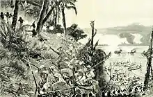 In June 1884 Nachtigal reached Sangareya bay and the Los islands. He sent a party ashore to seek treaties with the rulers of Kapitaï and Koba.[11] However, by the time he arrived the local chiefs had already reached agreements with France, and did not want to sign any new treaties.[12] Nachtigal therefore steamed on to the German trading posts on the Bight of Benin.[8]