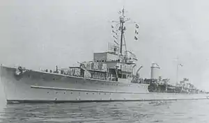 The ships carried eight above-water 53.3-centimetre (21 in) torpedo tubes in two power-operated mounts. Two reloads were provided for each mount. The standard torpedo for the Type 36B destroyers was the G7a torpedo.[14] It had a 300-kilogram (660 lb) warhead and three speed/range settings: 14,000 metres (15,000 yd) at 30 knots (56 km/h; 35 mph); 8,000 metres (8,700 yd) at 40 knots (74 km/h; 46 mph) and 6,000 metres (6,600 yd) at 44 knots (81 km/h; 51 mph).[15] They had four depth charge launchers and mine rails could be fitted on the rear deck that had a maximum capacity of 74–76 mines. 'GHG' (Gruppenhorchgerät) passive hydrophones were fitted to detect submarines and an S-Gerät sonar was also probably fitted. The ships were equipped with a FuMO 24/25 radar set above the bridge.[16]