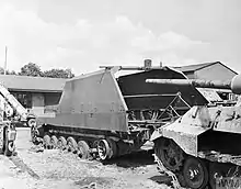 ![]() Abandoned prototype chassis of the Geschützwagen Tiger für 17cm K72 (Sf) with an abandoned Tiger II beside the tank and a Jagdtiger behind. | |