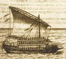 The Sultanate of Aceh is famous for the use of Ottoman-derived galleys. Aceh's term for galley is ghali, which is derived from the Portuguese word galé, not from the Turkish term for it (Kadırga).[1]: 163 The Acehnese in the 1568 siege of Portuguese Malacca used 4 large galleys of about 40–50 meters long each with 190 rowers in 24 banks. They were armed with 12 large camelos (3 at each bow side, 4 at the stern), 1 basilisk (bow-mounted), 12 falcons, and 40 swivel guns.[1]: 164 By then cannons, firearms, and other war materials had come annually from Jeddah, and the Turks also sent military experts, galleys experts, and technicians.[12] The average Acehnese galley in the second half of the 16th century would have been about 50 meters long and had two masts that were equipped with square sails and topsails, not lateen sails like those of Portuguese galleys.[13]: 106–107 [14][1]: 165 It would have been propelled by 24 oars on each side, carrying about 200 men aboard, and armed with about 20 cannons (2 or 3 large ones at the bow, with the rest being swivel guns).[1]: 165