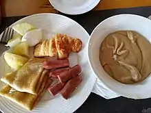 Fried sweet foods include cubed and spiced ripe plantain (kelewele) sometimes served with peanuts. Koose made from peeled beans (and its close twin acarajé or akara made from beans which are not peeled), maasa,[16][17] pinkaaso,[18] and bofrot/Puff-puff[19] (made from wheat flour); waakye[20] dzowey and nkate cake (made from peanuts);[21] kaklo and tatale[22] (ripe plantain fritters); kube cake and kube toffee (made from coconut); bankye krakro, gari biscuit,[23][24] and krakye ayuosu (made from cassava); condensed milk, toffee, plantain chips (or fried plantain)[25] and wagashi[26] (fried farmer's cheese) are fried Ghanaian savory foods (confectionery).