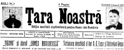 Boangiu writes that, as the conflict between the two Voivodes was turning bitter, both figures engaged in "obvious manipulation" of the truth.[137] In the wake of the death hoax, Lăzurică and his followers announced that they would take up the offensive against "certain left-wing newspapers", since these had denied the Romanies' "assimilation into the Romanian element". To signal their visibility and commitment to "integral nationalism", they staged a rally in Iepurești, with speeches by Lăzurică, Șerboianu, Zima, Gheorghe Bașud, Ghiță Slobozeanu, and other community representatives.[138] In his first-ever Țara Noastră editorial, Șerboianu, passing himself off as a member of the Romani community, reported that he had always fought alongside "the Roma comrade G. A. Lăzurică, who was not overcome either by intrigues, either by the lures or the cowardice of some of our brethren."[139] Their platform, also taken up by Mirmillo, simply denied that Romanies were an ethnic minority, generally describing them as a variety of the Romanian people; they also argued that, being "too good Romanians", they would limit Romani-language content to just one page of the newspaper.[140]