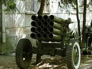 At least 8, and possibly 12, rockets struck within a 1500 by 500-meter area in the Zamalka and nearby Ein Tarma neighborhoods.[note 2] The rockets were all of the same improvised type, each with an estimated capacity to carry 50–60 liters (11–13 imp gal; 13–16 U.S. gal) of sarin.[1]:9[21]:24 The rocket engine was similar in type and parameters to a 122 mm GRAD unguided surface-to-surface rocket, while the chemical warhead and the stabilization fin was of an artisan-type.[1][78] One (or both) of the labs examining the environmental samples taken from Zamalka (and Ein Tarma[21]:28–29) found at least traces of sarin in 14 of the 17 cases.[2]:45–49 One of the labs described the sarin level as a "high level concentration" in 4 of the 17 samples.[2]:45–49
