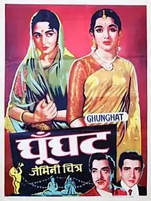 Ghunghat is a 1960 Hindi drama movie directed by Ramanand Sagar and produced by S.S. Vasan from Gemini Studios. The film stars Bharat Bhushan, Pradeep Kumar, Bina Rai, Asha Parekh, Leela Chitnis, Rajendranath, Rehman and Agha. It is an adaptation of Rabindranath Tagore's 1906 Bengali story Noukadubi (The Wreck). The film's music is by Ravi, while the songs were penned by Shakeel Badayuni. The film became a hit at the box office. Musically also, it was liked by the audience. "Laage Na Mora Jiya" and "Mori Chham Chham Baje Payaliya" sung by Lata Mangeshkar were hit songs from the film.[1]