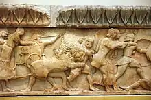 - Lion or Leon (Λέων): Possibly a Giant, he is mentioned by Photius (as ascribed to Ptolemy Hephaestion) as a giant who was challenged to single combat by Heracles and killed.[211] Lion-headed Giants are shown on the Gigantomachy frieze of the second century BC Pergamon Altar.[212]