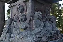 It was made in 1813 by Ikegami Heiuemon Shuko, a stonecutter in Takato(Currently, Ina-shi, Nagano-ken).[2] It is made of andesite and is 370cm high.[2] Under the roof, the upper layer is carved by relief engraving with the images of Buddha in all four directions and the lower layere with iamges of Sixteen Arhats, and the lotus seat and its lower part are also meticulously carved.