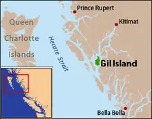 Gil Island is an island on the North Coast of British Columbia, Canada, located on the west side of Whale Channel in the entrance to Douglas Channel, one of the main coastal inlets, on the route of the Inside Passage between Pitt Island and Princess Royal Island. It is 26 km (16 mi) long, with a width ranging from 6 to 13 km (4 to 8 mi), and an area of 231 km2 (89 sq mi). The only named summit on the mountainous island is Mount Gil, which faces the opening of Douglas Channel.[1]
