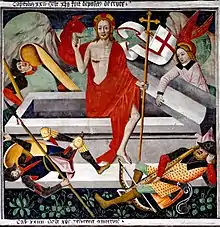 In the Denial of Peter, a soldier stands at the wall that separate the interior and exterior space. The depiction of him turning to the left while pointing his sword to the right serves to connect two successive scenes. This panel is also linked to the previous one as the maid who points to Peter with her right hand while pointing her left hand to the indoor where Christ is located in the previous panel.[32] This technique is used to emphasize the contiguity of successive events; on the other hand, the discontinuity of settings is stressed by a man standing at the extreme right side who was but by the frame.