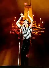Madonna and Ciccone decided to work with five different choreographers, one of them being American actor Gene Kelly, whom the singer wanted to choreograph the performance of single "Rain".[18] However, tension soon arose as Kelly was uncomfortable with the dancers; he believed they had been selected based on personality rather than for their abilities as dancers. He also wasn't too fond of the show's "heavy sexual overtones", according to Ciccone.[18] Feeling Kelly's position wasn't working out, Ciccone convinced the singer to fire him; eventually, Madonna, "shamefaced at having single-handedly conceived of such a terrible fate for this venerable American icon", agreed with her brother and dismissed Kelly.[18] Alex Magno was then appointed one of The Girlie Show's main choreographers.[19] For the show's main theme, Madonna and her brother agreed on a "burlesque circus" and, for inspiration, would watch Bollywood films, Thai dance numbers, Carol Reed's Trapeze (1956), as well as the work of Marlene Dietrich, Louise Brooks, Erté, and Zizi Jeanmaire.[18] Like Blond Ambition, The Girlie Show was divided into four different thematic acts: Dominatrix, Studio 54, Weimar Cabaret, and an encore.[20]