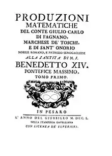 This article incorporates text from a publication now in the public domain: Herbermann, Charles, ed. (1913). "Giulio Carlo de' Toschi di Fagnano". Catholic Encyclopedia. New York: Robert Appleton Company. - O'Connor, John J.; Robertson, Edmund F., "Giulio Carlo de' Toschi di Fagnano", MacTutor History of Mathematics Archive, University of St Andrews