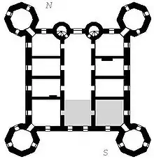 The building stands on a 2.5-meter-high granite base and rises directly out of the water. The castle is made of white plastered brick, which was largely removed and reused from the demolished monastery. The base area is a square with an edge length of almost 30 meters, consisting of three individual houses, each with its own floor plan and roof. While the middle house accommodated the large halls and the vestibule, the two side houses were fitted with the living rooms. The palace chapel, with its east-facing altar wall, is the only room that was placed across the overall floor plan and is located in the east and middle house at the same time.