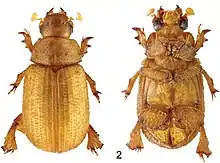 These beetles are small, 2.5–6 mm long, and have the stocky appearance typical of fossorial scarabs, with short, heavy, spurred legs. Color ranges from tan to dark brown, and the back is covered with short setae.