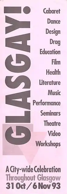 The festival launched on Saturday 30 October 1993[2] as a biennial event with the goal of making the lesbian and gay communities of Glasgow more visible and changing public opinion about lesbian and gay people.[1] Over 26,000 people attended between 30 October and the festival's end on 6 November.[1][2] There was some backlash to the festival, especially in regards to the festival being funded by public money.[1][2]