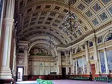The ornate banqueting hall, which is 33.5 m (110 ft) long by 14.6 m (48 ft) wide and 15.8 m (52 ft) high, is decorated with huge murals by the Glasgow Boys.[5] The decoration was co-ordinated by architect William Leiper.[15] The room hosted Nelson Mandela and Sir Alex Ferguson when they received the Freedom of the City in 1993 and 1999, respectively.[5] The Council Chamber is clad in Spanish mahogany panelling and its windows are made of Venetian stained glass.[5]