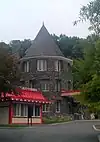 The central entrance to the park is dominated by Chautauqua Tower, a Richardsonian Romanesque circular structure of irregularly shaped, rough-faced stone. Construction of the tower was started in 1890 or 1891 and completed in 1892. It is about 34 feet in diameter and three stories high, capped by an 11-sided roof of steep pitch with a flagpole rising from its peak. It is the sole intact physical remnant of the late-19th century Chautauqua movement at Glen Echo, and as a local specimen of late-Victorian rustic architecture.[2]