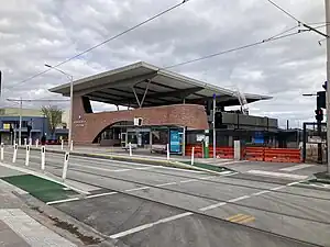 ![]() Station entrance and westbound tram stop in October 2023 | |||||||||||||||||||||||||||||||||||||||||||||||||||||||||||||||||||||||||||||||||||||||||||||||||||||||||